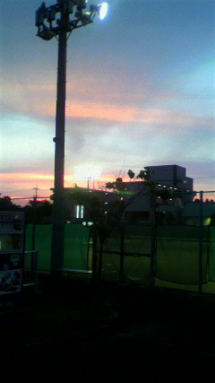 朝テニスの予定が、雨でボツ(-_-;) 仕方なく夜に振り替えました。 こんな夕焼けの中でのテニスもなかなかおつなもの(^O^) でも慣れないからボールが見えにくかった。 蒸し暑いものの、日焼けはしないし、プレイ後のビールは格別だし…(^.^) これで食べなきゃ飲まなきゃ、痩せるのに~(^_^;)