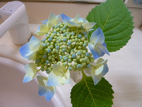 うちのお庭で咲きました梅雨は嫌いだけど、紫陽花だけがさわやかさを伝えてくれますね母ミヤコも昔から土いじりが大好きでお花も野菜も作るのが得意です毎年春になると目の前の保育所から入園式用にお花のプランターを貸してと頼まれるくらいパンジーも、種から育てます枯らし専門のおねえちゃんの庭でもたくましいお花だけが生き残って、おねえちゃんは遠くから自然に任せてがんばれよ~とエールを送るだけなのに紫陽花も毎年どんどん元気に立派になってくれます不思議やわ~ミヤコは自分が育てたお花をちょっと摘んではセンスなど皆無で家中に飾ったりしますおねえちゃんも特に洗面所に飾るのが好きですこういうとこは母子だな~と思うわずかな一面です