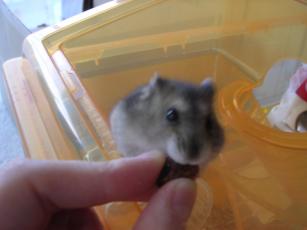 昨日お話しましたが、昨日は主人のお誕生日でした前日からの出張で、帰りが夜だったのでケーキでささやかなお祝いをしましたまだ子供もいない私たちは二人で食べきれるサイズの小さなケーキですこのケーキ、何と\1050だったんです(笑)ケーキ代があまりに安くついちゃったので、前々から食べたいと言っていたゴディバのチョコレートアイスをプレゼントしましたっ少し食べさせてもらったら、とぉ~っても美味しかったです*きなこ*「パパさん、お誕生日おめでとう~っっ 今日はパパさんの日やから、パパさんの手の上ではおとなしくしとくわ~ いい子やろ~でも*きなこ*もケーキ食べたかったわぁ~」最近、お掃除してくれたりご飯をくれたりする主人にだいぶ懐いてきました主人「きなこありがとうな~!そっか~ケーキ食べたかったよな!でもケーキはアカンから 今日は*きなこ*の大好きなとこ入れたるわっ」*きなこ*「うっひょぉ~っなに、ここ!!すごいやんっ!! にんじんときゃべつの匂いする~ったのしーっ」いつもごはんで食べている乾燥したにんじんとキャベツとさつまいもの袋の中に主人が入れちゃいました・・・すでにペレット14個ぐらいが頬袋に入っているので、食べてはいませんでしたが、とっても気に入ってしまってなかなか袋から出てきてくれませんでした何とか外に出てくれた*きなこ*は満足そうでした*あす*「*きなこ*もお誕生日をお祝いしてくれてありがとうね~」一昨日の体重:私が量り忘れました昨日の体重:40g