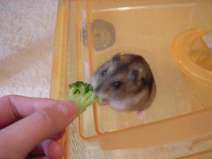 今日は共通の趣味を持つお友達と約3ヶ月程ぶりに会って、ランチに行って来ましたドイツ料理とビールのお店のようでしたが、お昼はランチメニューもしていて美味しそうなので入ったのですが、何とサラダ・パン・ポテトフライ・ドリンクがビュッフェスタイルで食べ放題だったので、友達と話し込みながら思いっきり堪能しました(笑)出来立てのキレイなお店だったので、気分もとても良かったです昨日の*きなこ*のごはんの前にブロッコリーをあげましたっ!*あす*「はい、きなこの好きなやつ」*きなこ*「くんくん・・・あぁぶろっこりー」*あす*「ブロッコリー美味しいね!!きなこ大好きだもんねっ」*きなこ*「すきすき~っんまいのよ~っ」デジカメを必死に構えながら、いつもおやつや野菜をあげている私。油断しているとすぐに奪われちゃいます・・・この時もデジカメを片手でイジってる時にふと手の力が抜けてブロッコリーをポロンその瞬間、大好きなブロッコリーを加えて猛ダッシュした*きなこ*はゲージの2階にあるきのこポッドに隠れちゃいました・・・でも!どうやらブロッコリーに意識を集中し過ぎたせいか・・・*あす*「きなこ~っ!おしりが見えてるよ~っっ」そのまま頭だけを隠して食べ続けていました~(笑)余談ですが、きなこのおうちは今木のおうちです。最近、ゲージの柵をガジガジしていないと思ったら、こんなとこをガジガジ・・・わかりますか??おうちの後ろ側の右柱部分??がかな~り削れています!!柵よりはいいけど、木のおうちがいつまで持つかな~?(笑)昨日の体重:40g