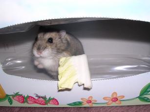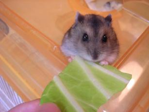 昨日はお休みしてすみませんでしたっ。祝日と言う事で、主人と買い物をしに出掛けたら1日掛かりになってしまい帰ってきたらヘトヘトになっていました(笑)今日は、朝からリビングとダイニングの模様替えと掃除を大掛かりにやりました!!まだ多少片付いていませんが、それは今度やるとして・・・(笑)とりあえず、気分サッパリにキレイになりましたでも、頑張って重いものを肩で持ったため、痣のような内出血ができてしまいました~見た目が痛そうなので見ないようにしています(笑)今日は*きなこ*には大きな音で驚かせてはいけないと思い、寝室にいてもらいました雰囲気が変わると気にしちゃうかな~って思いましたが、おうちにこもってひたすら眠っていたようです(笑)夕方、いい子にしていたので久しぶりにひまわりの種とかぼちゃの種をひとつずつあげたらとても喜んで頬袋にしまいましたはい、やっぱり目の前では食べてくれませんでした(笑)*きなこ*「みなさ~ん!*きなこ*はとっても元気やでんっ」*きなこ*「あたしはキャベツがんまんまで幸せやわ~ この顔見たら分かるやろ??幸せが伝わるやろか~??」夢中で食べていたので、珍しく写真が撮りやすくて助かりました野菜なら何とか目の前で食べてくれるので好きです(笑)昨日、ごはんにいつものように乾燥の人参をあげたんですが、珍しくおうちに持ち込まずに外で食べてくれました!!とは言ってもゲージ内のおトイレ内なんですけど・・・(笑)人間からしたら、そこで食べるのは止めて欲しいですが、*きなこ*にはとってもくつろげる場所なようです最近はちゃんとおトイレも使っているので、ちょっと心配ですが毎日の掃除で気をつけているので、とりあえずは自由にしてもらっています*きなこ*「ここ、落ち着くんよ~心配せんでええよ~ それにしても、にんじんんまんまやわっ」一昨日の体重:40g昨日の体重:主人が量り忘れました(笑)