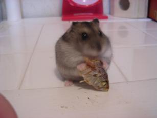 昨日の雨に引き続き、今日もどんより曇り空でした晴れた日でも洗濯物が乾きにくくなってきましたが、雨や曇りだと尚更です明日はいいお天気になるかな~昨日、おやつにこの間買った乾燥のシーフードの中にひとつ「干し魚」をあげてみました!なんだか大きめでちょっとあげるのを迷ったんですが、割と多めに入っているのでとりあえずチャレンジです*あす*「きなこ~!何かちょっと久しぶりなおやつだよね~ 見てみて!大きい魚!きなこ食べれる??」*きなこ*「んっ。・・・バリバリバリ・・・」あっという間に頭と胴体部分が半分に砕かれ、とりあえず頭辺りに齧りついています(笑)*きなこ*「頭は後で食べよ~っとん~いい歯ごたえ!いい匂い」頭部分をポイっと横に置いて、食べやすい胴体部分から食べ始めました!*きなこ*「これ大きいから食べるのも疲れてきたな~。 ちょっと背筋伸ばして食べよかな~っ」ちょこんっと上手にお座りして食べていますっ*あす*「あ!きなこドコ行くの!!」*きなこ*「追っかけてこないで~サザエさ~んっっ」♪おさかなくわえたきなこを~~おぉっかけてぇ~~・・・(笑)*きなこ*はお魚も大好きみたいですでもさすがに大きかったみたいで、後で回し車の下にお魚の頭部分が置かれてました・・・なんだかちょっと怖かったです(笑)昨日の体重:39g