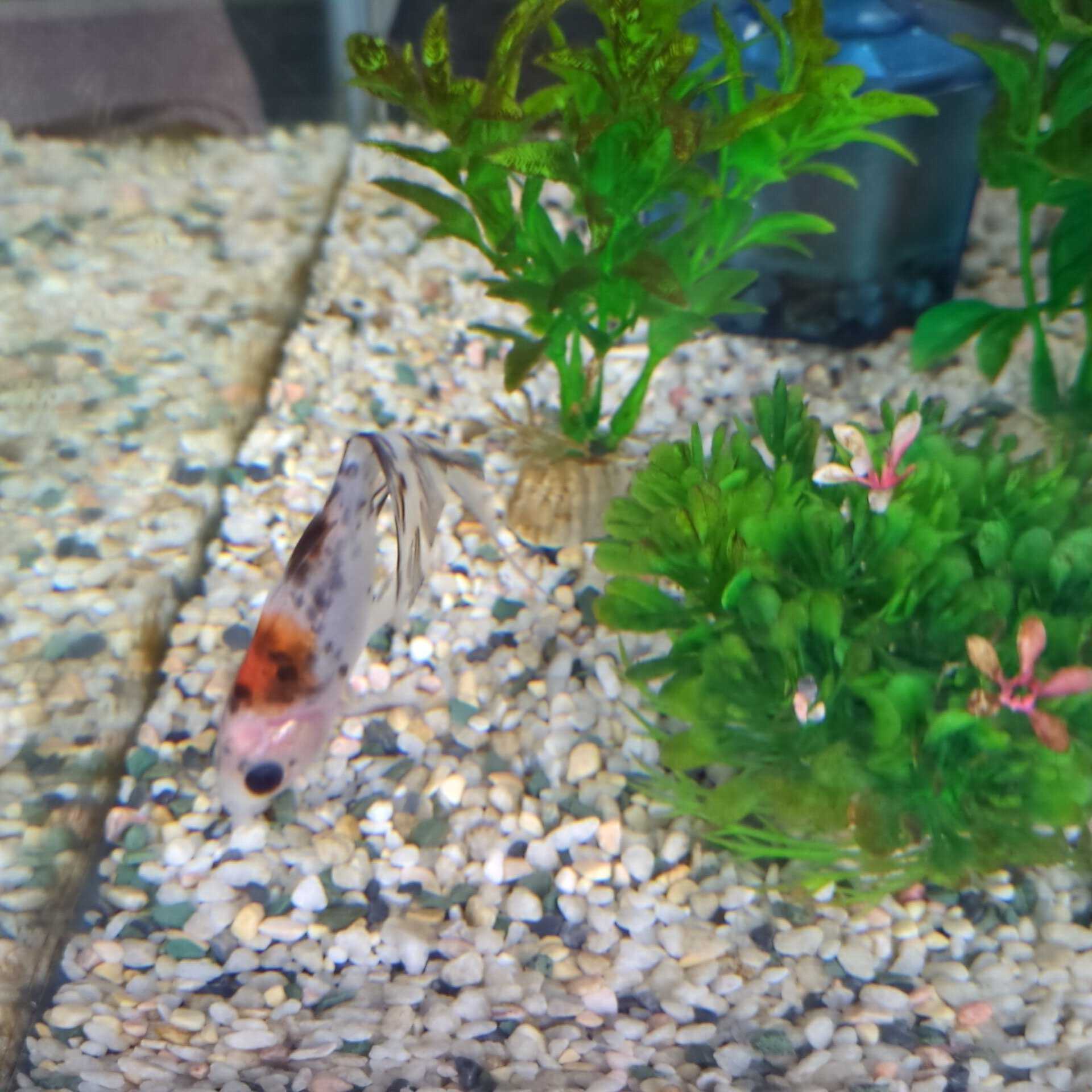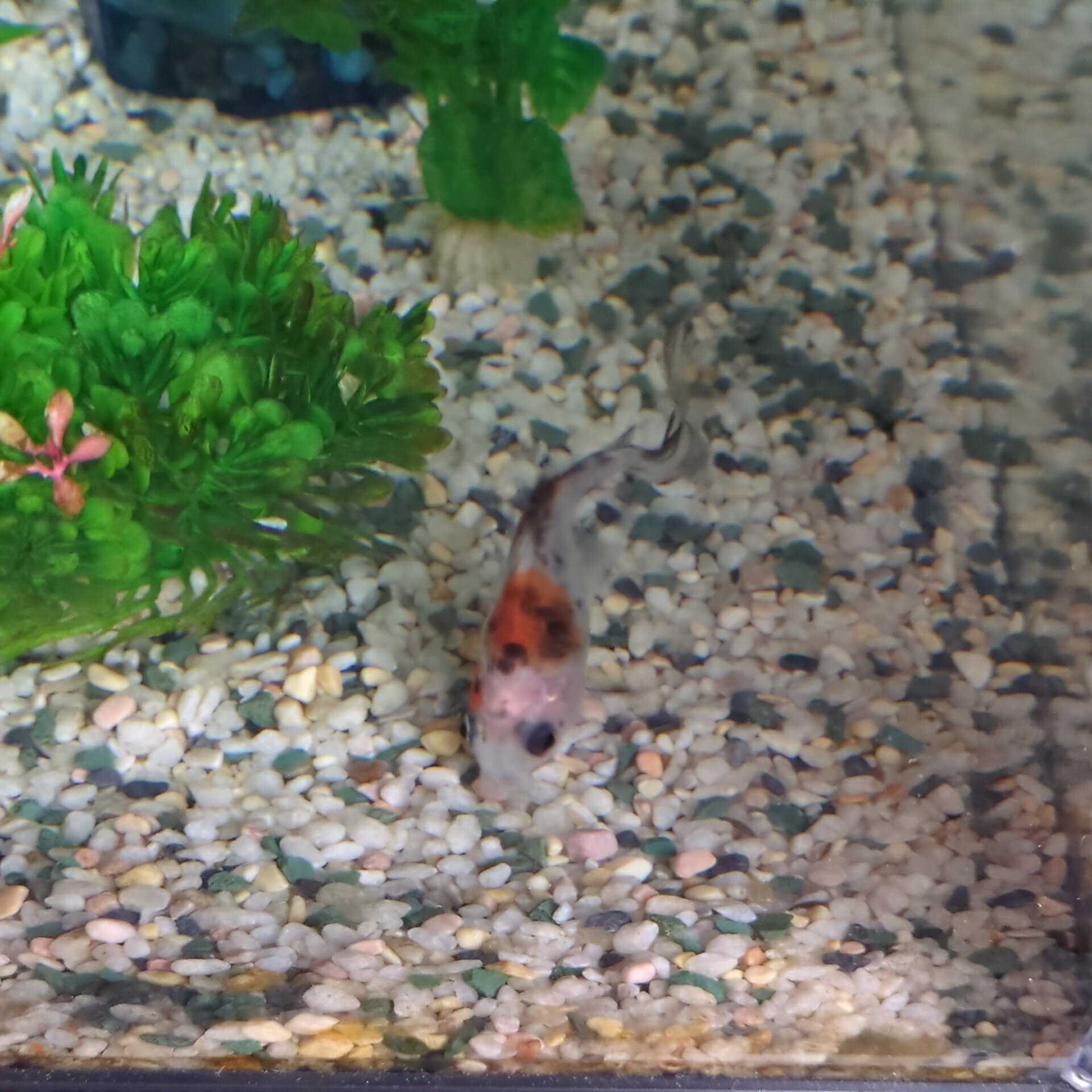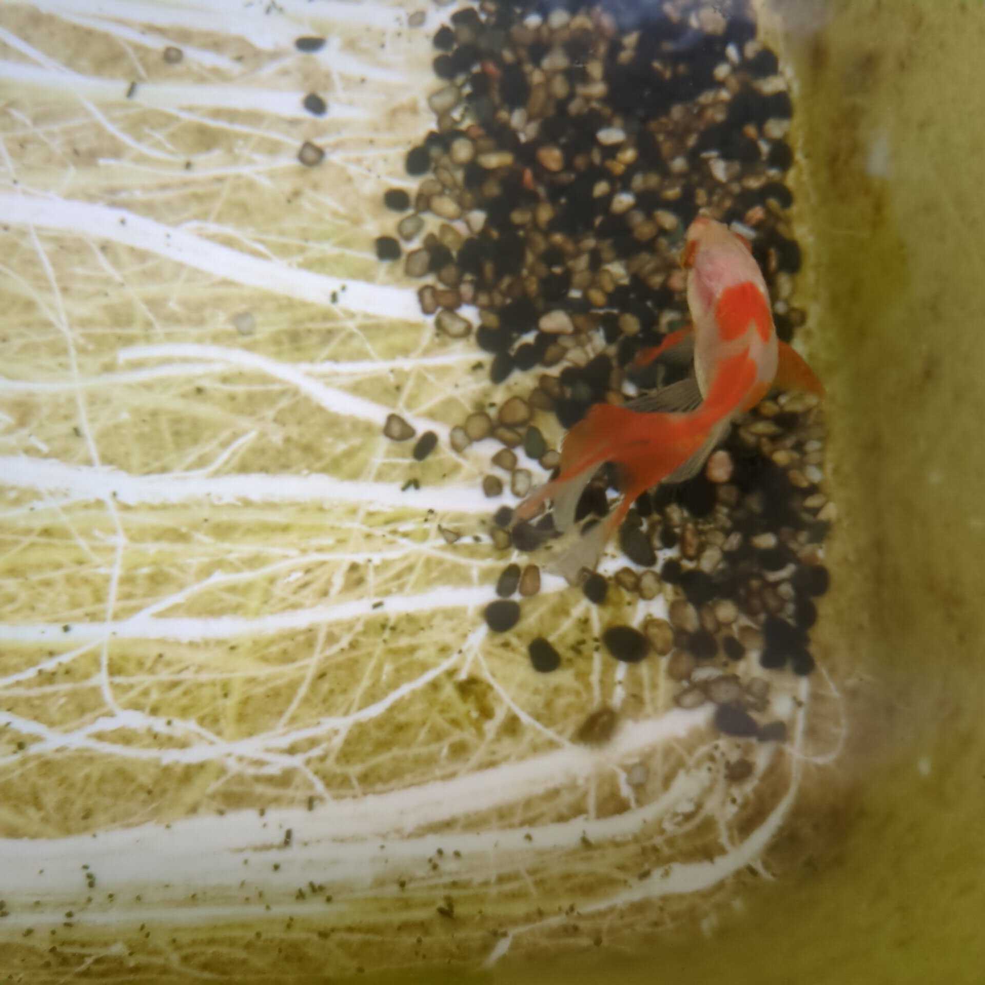 尾ぐされ病の経過観察を続けていた朱文金の東虎ちゃん。昨日まででもフラフラでギリギリの状態でしたが、今朝は一段と弱っている様子でした。このように横たわってしまっています。それでも昨日は朝夕と餌を食べて泳げるようにはなっていたので、今日も餌を食べてくれたら回復するのではと期待して餌を与えてみました。底に沈んだ餌に反応して、一瞬食べそうにも思えましたが…全く食べず。そして、私が仕事に行っている間に東虎ちゃんは天国へ召されていました。植木鉢に埋葬して、フカフカの新しい土を上から被せてミントとアイビーを差しました。植物が根付くか分かりませんが、もし根付いたらこれも東虎ちゃんの思い出として大事に育てていこうと思います。東虎ちゃんとは1年半くらいの付き合いでしたので、長く病んでいて心の準備はできていたとはいえ居なくなったことはやっぱり辛いです。コメットの朝日ちゃん(↓写真右)と今は亡き朱文金の似虎ちゃん(↓写真左下)と一緒に仲良く泳いでいた頃が、つい最近のはずなのにとても懐かしく感じます。口の変形で餌がスムーズに食べられず、また転覆症状、尾ぐされ病とたくさんの災難が降りかかりながらも最期まで生きようと頑張ってくれたことに心から感謝しています。私がもっとうまくお世話や看病をできていたらこんな結果にならなかったのにと後悔や申し訳ない気持ちは尽きませんが…。とにかくお疲れ様、今までありがとうと言いたいです。天国では元気でね、東虎ちゃん。当ブログは、にほんブログ村に登録しております。もしよろしければ↓のバナーをポチッとお願い致します♪