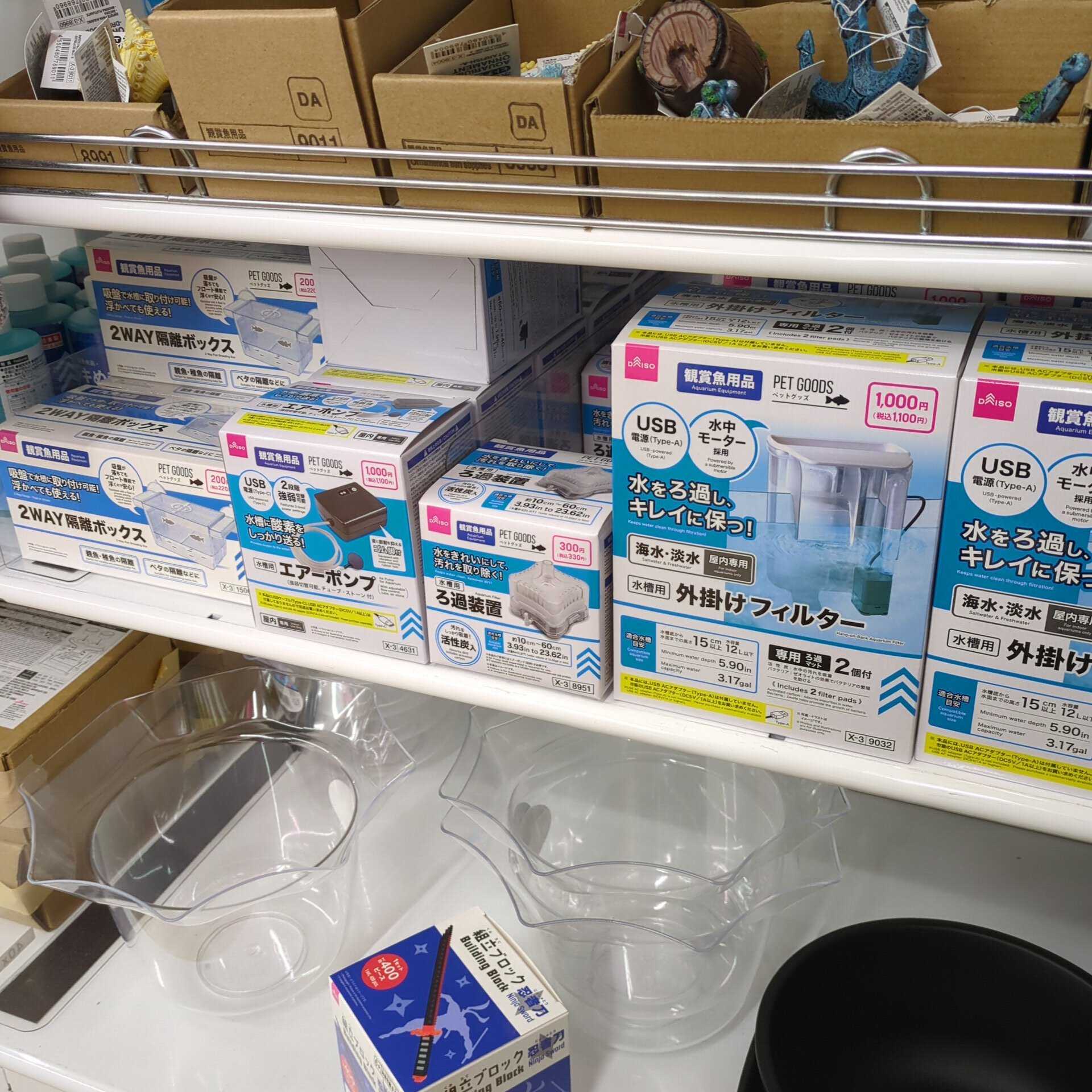 本日は買い物があり、1~2カ月ぶりにダイソーを訪れました。すると何やら、アクアリウムコーナーに異変が。おお!?見たことのないグッズがたくさん並んでいる。皆様もちょっとこの商品群、見てみてください。まず驚いたのがこちら、外掛けフィルター。USB電源とは便利ですね。専用のろ過マットは2個付いています。ダイソーの公式サイトを見ると別売りのろ過マットもあるようです。「バクテリア」と「活性炭」という2タイプがあるようですので気になります。こちらは活性炭入りのろ過装置。水作エイトやロカボーイのような投げ込み式ですね。本体の高さが低いため、水槽内レイアウトの邪魔をあまりしないんじゃないかと思います。値段もお手頃。こちらも交換用のフィルターが別売りであるようです。水作 エイトコア M 本体 投げ込み式フィルター ブクブク 40〜45cm水槽用GEX 本体 ロカボーイ M 40〜60cm水槽 投げ込み式フィルター ぶくぶく 関東当日便こちらもUSB電源式のエアーポンプ。エアーの強弱を調節できるのはとても良いですね。静音性は気になりますが、ゴム製の脚付きのためそれほど響かないのではないかな?と思います。まあこればっかりは使ってみないと何とも言えませんかね。安くて静音性が高いおすすめのエアーポンプはこちら↓コトブキ工芸 サイレントエア SA−1200S エアポンプ 〜40cm水槽これも欲しいな~と思ったのが、こちらの2WAY隔離ボックス。吸盤でも取り付けでき、浮かべることもできるので水換えの時に便利そうだなと思いました。買えば良かったな。前に来店した時も見かけた気がするんですがこの貼れる水温計シートも良いですね。デザインがシンプルだし水温が見やすそうです。「メダカにやさしい天然土」…前からありましたっけ?餌以外にもメダカの専用品がたくさんありますね。オシャレなサンドも発見。さらに、変わった餌も…?黒いサンドに楊貴妃メダカが映えますね。琉金のパッケージのブラウンのサンドも良い色です。コリドラスのパッケージのこちらは底生熱帯魚のエサタブレット!これでコリやナマズやドジョウの餌を突然切らしてしまっても安心ですね。ひとつ残念だったのは、こちらのエアチューブ。以前は、ソフトなシリコン製のチューブが3m100円で売られていて、私も使っていますがソフトチューブの長さが1mに短くなってしまっています。ビニール製の方は3mなのですが、こういったチューブは固いので扱いづらいです。使っているうちに劣化してさらに固くなってしまいますし。エアチューブに関しては、ソフトタイプが欲しいならネットで長いのを買う方が安いのかなと思いました😅シリコンタイプ エアーチューブ (乳白色) 10mということで、本日は気合の入ったダイソーのアクアコーナーをご紹介しました。ダイソーさんは、もしや「街のアクアショップ」を目指しているのかな?と思うほどの品揃えでした。もしかしたら、そろそろガラス水槽も1500~2000円くらいで売り出してくれるのでは…と勝手に期待してしまいました(笑)当ブログは、にほんブログ村に登録しております。もしよろしければ↓のバナーをポチッとお願い致します♪
