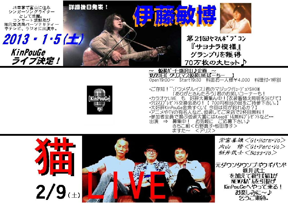 ~ コスプレ<仮装>パーチー盛沢山♪企画 ~//////////////////////////////////////////12/23日【X`mas<仮装>LIVEぱーちー】//////////////////////////////////////////Open19:00~ Start19:30 料金お一人様¥4,000 おでん付・1杯別 http://plaza.rakuten.co.jp/kinpouge/・ご存知!^^;「ウメダルイス」君のマジックイリュージョンSHOW 「ありがとさんたろう」君のお笑いコーナーも!・カラオケLIVE も 好評大募集ん中!【衣装着替え照明を浴びて】・クリスマスプレゼント交換会あり! 【 700円相当の品をご持参下さい。】・大好評KinPouGe金魚すくい【 今回は何が釣れるか?】・アニメやTVの有名人など、仮装してご来店で2杯目無料!・参加者全員で選ぶ仮装大賞にはKeepボトル無料プレゼントなど・・・出演 ⇒ 募集中! お気軽に ご応募下さい♪もぞもぞ虫 <中島みゆき・RCサクセション>阪南ブラザーズ <OLD関西フォーク> さちこ組<キャンディーズ・石野真子・大田裕実・麻丘めぐみCoverバンド> ますた~ <オリジナル・Beatles>