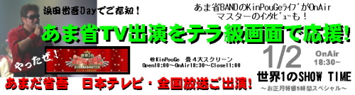 ~祝!あまだ省吾BANDのKinPouGeライブが日本テレビ系列全国OnAirだ 企画~1/2水【あま省『世界1のSHOW TIME』出演を応援!】Open18:00~ OnAir18:30~ Close11:00 / 飲食代金のみジャニーズ松潤くん&真矢みき司会・日本テレビ『世界1のSHOW TIME』でご存知・浜田省吾Dayのあまだ省吾クン率いるあまだ省吾BANDのKinPouGeでのライブ模様がOnAirされますマスターのインタビューも流れる!その他、全国最強のコピーバンドが集結だ!KinPouGeのテラ級・畳4枚大スクリーンであまちゃんの晴れ舞台を観戦&応援!