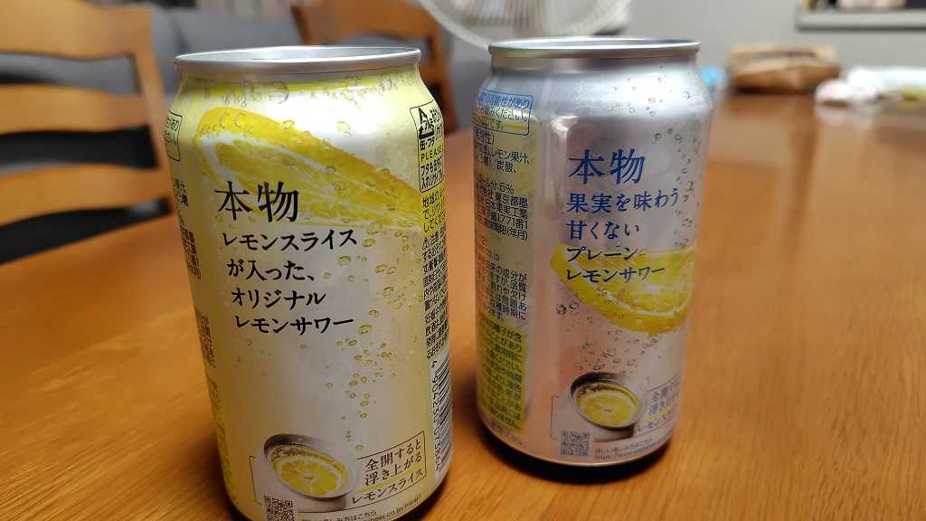 「本物レモンスライスが入ったオリジナルレモンサワー」と「本物果実を味わう甘くないプレーンレモンサワー」という長い商品名のサワーです。