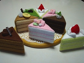 お待たせしました!何かバタバタしていて、写真の準備とかがなかなかできなくて遅くなってしまいました…。また少しずつUPしていきますので、お楽しみに~♪今日はフェルトスイーツで、カットケーキです♪以前作った、チョコレートケーキ・いちごのショートケーキ・抹茶ケーキ・チョコレートムースのケーキに、新作の、キャラメルバナナのケーキと、バラのケーキを足して、ケーキバイキングにしてみました。こちらは、オークション用に作ったものです。