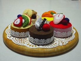今日も、フェルトスイーツです♪今回は、ミニケーキ5コのセットで、オークション用に作ったものです。先日紹介した、チョコチェリーケーキ・キャラメルバナナケーキ・オレンジケーキと、以前紹介した、フルーツカスタードケーキ・ベリーケーキのアレンジ版です。フルーツカスタードケーキは、オレンジをりんごに変え、ベリーケーキは、今回のミニケーキに合わせて、高さを変え、ラズベリーをプラスした、ベリーズケーキになっています。