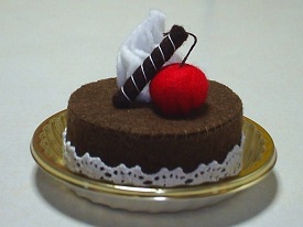 今日もフェルトスイーツで、チョコチェリーケーキです♪丸型のシンプルなチョコレートケーキの上に、ホイップクリームとチェリーをのせて、チョコ棒を添えました。こちらは、ミニケーキになります。