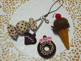 今日もフェルトスイーツです♪ケーキやアイスなどの、スイーツストラップを紹介してきましたが、今回は、オークション用で、きせかえタイプのスイーツストラップを作ってみました!『可愛い~』と好評のドーナツと、アイスクリームのチョコ味バージョンです。キャンディーとハートチョコは固定で、アイスクリームとドーナツを付け替えられるようにしました。