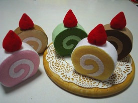 今日もフェルトスイーツで、ロールケーキです♪以前作ったロールケーキの、バニラ・チョコ・抹茶に、今回は、イチゴ・キャラメルを加えて、5種類の味のSETにしました。今回も、すべてに大きめのいちごをのせました。こちらもオークション用に作ったものです♪