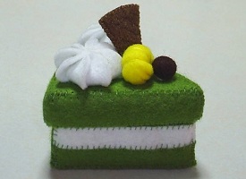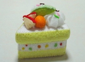 今日はフェルトスイーツで、スイーツBOXです♪今回は和スイーツで、抹茶ケーキにしてみました。抹茶に白い生クリームの組み合わせは、よく合いますね。黄色いのは栗なんですが、ちょっと黄色が強すぎたかなって気がします…。中は、こげ茶のドット柄です。チョコっぽくて、抹茶ケーキと合いますね。