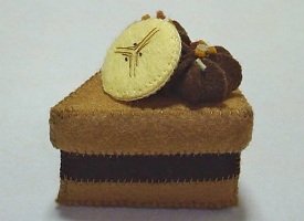 今日はフェルトスイーツで、スイーツBOXです♪今回は、キャラメルバナナケーキを作ってみました。キャラメル風味のスポンジケーキに、チョコムースをはさんで、輪切りのバナナと、チョコクリームをのせました。クリームの上には、カットしたキャラメルの粒とナッツをかけました。中はこげ茶で、LOVEの文字柄が可愛いです。
