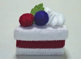 今日はフェルトスイーツのスイーツBOXで、ベリーのケーキです♪ヨーグルト風味のムースケーキに、ラズベリームースをはさんで、ブルーベリーとラズベリーをのせた、ダブルベリーのケーキです。中は、赤のドット柄にしました。