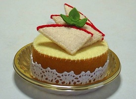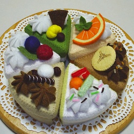 今日はフェルトスイーツのミニケーキで、オレンジのケーキです♪前に作ったオレンジケーキは、皮をむいた実だけのオレンジを使いましたが、今回のオレンジのケーキは、1/4カットのスライスオレンジにしました。こっちの方が作り方は簡単です。