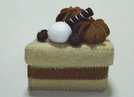 今日はフェルトスイーツで、スイーツBOXです♪今回は大人のケーキで、モカケーキを作ってみました。ちょっとほろ苦い、コーヒー風味のスポンジケーキに、甘さ控えめのチョコクリームをはさみました。上にのせたクリームやチョコも、ビターで大人の味です。中は、こげ茶でLOVEの文字柄。前回の、キャラメルバナナケーキと同じです。