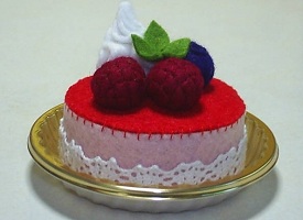 今日はフェルトスイーツのミニケーキで、ラズベリーのムースケーキです♪ふんわりとした口どけのムースの上に、甘酸っぱいラズベリーソースをかけて、クリーム・ラズベリー・ブルーベリーをのせました。