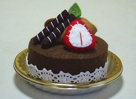 今日はフェルトスイーツのミニケーキで、チョコイチゴのケーキです♪チョコレートコーティングしたチョコ味のケーキに、チョコクリームと、スライスイチゴと、チョコ棒をのせました。定番のデコレーションですが、いちごとチョコ棒の組み合わせは、好きなんです。