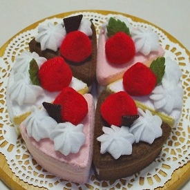 今日はフェルトスイーツです。以前紹介したミニミニケーキで、マグネットを作りました♪可愛くできあがったので、これはオークションに出品しました。5コセットで、ギフトBOX入りです。別写真もあるので、よかったら見てみてくださいね。大きさは約2.6cm、可愛いミニミニサイズのケーキです。(これは上のセットとは別の分です)