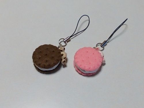 今日はスイーツストラップです♪クリームサンドビスケットのストラップを2種作りました。こちらはストラップですがストラップ金具をイヤホンジャックに変えてつけられる小さめサイズのビスケットです。