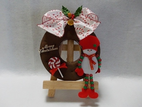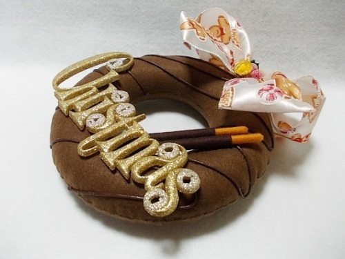 今日はぷっくり大きなドーナツをそのままリースにしてみました♪チョコソースがかかったドーナツにキラキラゴールドのChristmasの文字プレート・スティックチョコ・シュガーキャンディがついています。ジンジャーマン柄のリボンが可愛いです♪