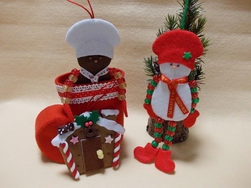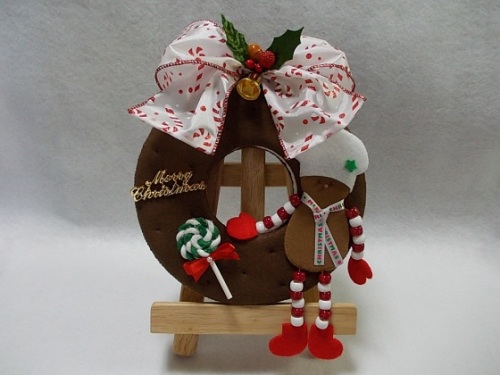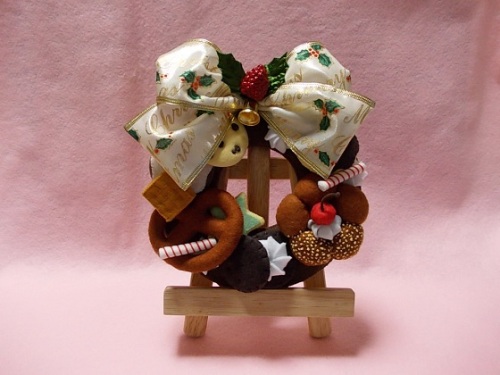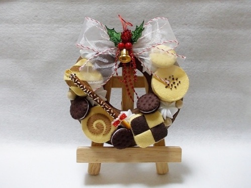 ちょっと早いですが、今年もクリスマス作品を作り始めました。クリスマス限定のフェルトスイーツとなりますのでお早めにどうぞ♪クリスマス作品は12月初め頃まで製作する予定です。こちらはお菓子のリースです。クリームをはさんだチョコビスケットをクリスマスリースにしました。昨年オーナメントとして登場したケーキ職人のパティシエジンジャーマンをつけてみました。ジンジャーマンの手足はユラユラと動きます。