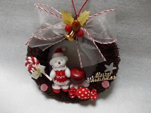 今日はデコベア&キャンディのクリスマスリースです♪サンタ服を着たベアちゃんとキャンディがついたリースです。土台のリースは今回初めて毛糸を使って作ってみました。ふんわりモコモコであったかい雰囲気のリースになりました。