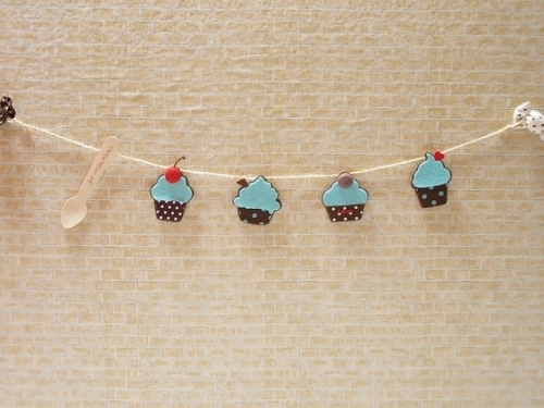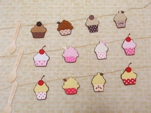 今日は新作!スイーツガーランドです♪アイシングクッキー風のモチーフを使ったガーランドです。今回は、カップケーキのガーランドを作りました。こちらはチョコ系のカップケーキですこちらはレッド系ですこちらは可愛いピンク系ですこのカップケーキではスイーツクリップを作っていますが、お部屋やお店の壁に飾ったら可愛いかなーと思いガーランドにしてみました。こちらは全長50cmのショートサイズなので、1つ2つ3つと組み合わせて飾っても可愛いし、壁に飾る以外にオープン棚やコルクボード・かごやボックスなどをデコレーションしても可愛いと思います。