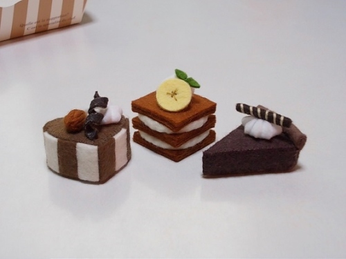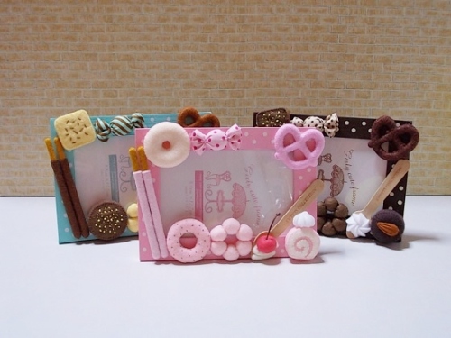 今日はオーダー作品です♪こちらはドーナツやクッキー・お菓子などがついたスイーツフォトフレームですこちらはカップケーキの小物入れです楽オクでは以前からオーダーを受け付けていますが、一応オーダーについて書いておきますね。まず、お受けするのはリピーター様からのオーダーのみとさせていただいております。ご購入いただいている方は実際に作品を手に取って見ていただいているので、オーダーに関するやり取りがスムーズでオーダーを受けやすいためです。そして、オーダーが可能なのは下記のこれまでに作った作品のもので、色指定や簡単なアレンジのみとさせていただきます。・デコレーションケーキ・ミニケーキ・プチケーキ(ミンネのギャラリー/フェルトのケーキショップのケーキはこれです)・スイーツフォトフレーム・お菓子のリース・スイーツマグネット・お菓子のプレート・スイーツBOX基本的にこれまで受けてきたオーダーは、私の作るものがどんな感じかわかっていただけているリピーター様なので、簡単な指定のみでデザインはお任せしますと言っていただいております。細かいご指定はちゃんと伝わらない可能性がありますのでお受けしません。納期については、作るものの種類や数量によって異なりますが、1週間~10日程度になります。オーダーが重なった場合は順番にお作りしますので2週間~1ヵ月程かかることもあります。以上、簡単ですがオーダーについて書いておきました。