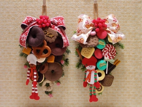 今日はスイーツスワッグです♪左はドーナツ、右はお菓子です。こちらはドーナツです☆手足がゆらゆら動くパティシエジンジャーマンとドーナツをいっぱいつけました♪こちらはお菓子です☆パティシエスノーマンに、クッキー・マカロン・クリームサンドビスケット・チョコスティック・ペロペロキャンディなどのお菓子をつけました♪今年はお菓子のリースの代わりにずっと作りたかったスイーツスワッグを作ってみました!スワッグのこの形が好きでスイーツと合わせたら可愛くなると思っていたので作りたかったんです!お部屋の壁やドアに飾るとホント可愛いです☆