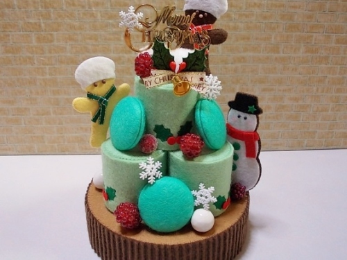 今日はクリスマスカラーのマカロンがのったケーキです♪マカロンの赤と緑が映えるように土台のケーキは白にしましたこちらはマカロンが白いので土台のケーキはチョコ系クリームの色にしましたクリスマスピックやひいらぎピック、雪の結晶パーツ、シュガービーズ、ベリーピックなどを使ってクリスマスバージョンのケーキを作りました。サイズは通常のフェルトケーキと同じです。マカロンはラメをつけてキラキラにしました。