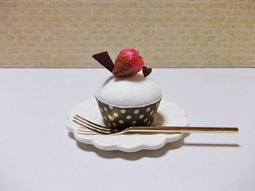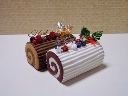 クリスマス作品の販売を開始しました♪今年最初のクリスマス作品は、ブッシュドノエルです。チョコとホワイトの2種類作りました。側面のクリームにフォークで筋をつけたみたいなリアル感をだしました。この筋は手ごわいです!今回は側面全部になので、ものすごーく時間がかかります。こちらはチョコです☆こちらはホワイトです☆まだハロウィンも終わってませんが、クリスマス作品を作っているとクリスマス気分になります。クリスマス作品を作るのは本当に楽しいです♪期間限定なのが残念…今年はこのブッシュドノエル(側面全部に筋を入れるやつ)を作ろうと思っていたので最初に作り始めました。土台のロールケーキを作るだけで想像以上に時間がかかってしまったので、デコレーションはフェルトで作らずに市販のピックやパーツなどを使いました。デコレーションまで作っていたら他のクリスマス作品が作れなくなってしまうので…。今年のクリスマス作品の製作予定は、お菓子のリースが時間的に作れそうにないのでそれに代わるものとして前々から作ってみたかったお菓子のスワッグ(壁やドアに飾るかざりです)を作りたいと思っています。その他には、クリスマスバージョンのロールタワーケーキやケーキセットを作りたいと思っています。どのくらい作れるかは分かりませんが、可愛いものを作っていきたいと思います!◇◆◇クリスマス作品の販売について説明しておきます◇◆◇クリスマス作品は期間限定・数量限定での販売です。クリスマス作品は作るのにとても時間がかかるものが多く期間限定での製作ということもありますのでオーダー製作はお受けできません。早い段階で売り切れてしまった作品については再販も検討したいと思いますがお約束はできませんので、気になるものがありましたらお早目のご購入をお勧めします。*今年は楽オクでのクリスマス作品の出品販売は予定しておりません