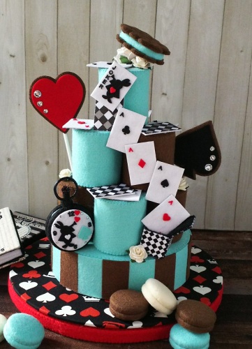 今日は不思議の国のアリスをイメージして作ったロールタワーケーキです♪うさぎシルエットの懐中時計です☆箱から飛び出すトランプです☆1枚1枚作りました!チョコミントのロールケーキを作り、これをどんなデコレーションにしようかと悩んでいた時にふっと浮かんだアリス。懐中時計をのせたくて1番に作り、あとはトランプマークのモチーフをと思っていたんですが、トランプが箱から飛び出してカードが散らばっている感じにしたら可愛いかも☆と思い小さなトランプをたくさん作ってのせてみたらなかなかイイ感じだったので変更!トランプに変更したら最初に作った懐中時計が合わなかったので作り直し、このケーキが完成しました♪