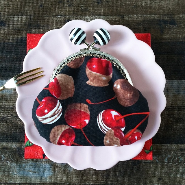 今日はチョコレートコーティングされたチェリー柄のがま口です♪大人可愛いがま口です☆実は前回紹介したがま口のブルーベリー柄みたいに全面ぎっしりのチェリー柄の生地を見つけたんですが、後で買おうと思いいざ買いに行ったら売り切れてしまってました…再入荷を待っているんですが今のところ入荷は無く、もしかしたら再入荷は無いのかも…そんな時にこのチョコがけのチェリー柄を見つけたので即買いしました!