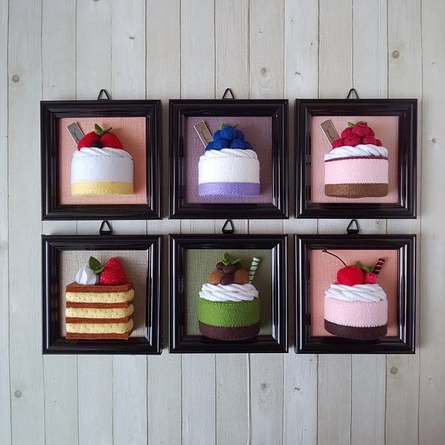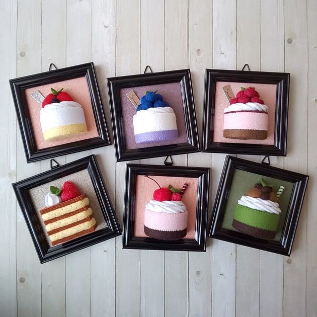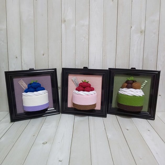 今日は新作☆額縁に入った立体ケーキ、全6種です♪上の段の左から、イチゴのショートケーキ・ブルーベリーケーキ・ラズベリーケーキ下の段の左から、ミルフィーユ・さくらんぼケーキ・抹茶ケーキです立体です☆先日ケーキ以外のものを製作する機会がありそこでフレームを使ったんですがケーキでも使ってみたくて壁に飾れるケーキを作りました。額縁はフレーム枠と土台を組み合わせて作っています。ケーキの背景にはリネン、額縁の裏は黒地×白ドットのUSAコットンを使用しています。自宅用にもプレゼントにもおすすめです♪