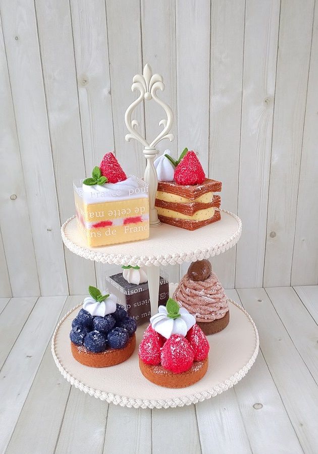 今日は、ケーキスタンドとケーキのセットです♪ケーキスタンドはこのケーキを飾るための専用スタンドです。ケーキは定番の6種類・イチゴのショートケーキ・チョコレートケーキ・モンブラン・ミルフィーユ・タルトレット(いちご)・タルトレット(ブルーベリー)ケーキの定番モンブランですが、定番なのに今までなかなか納得いくものが作れずにいましたが、今回ようやくモンブランらしいモンブランが完成しました♪スタンドの支柱だけを売っているのを見つけてしまい、フェルトケーキを飾れる2段スタンドを作りたくて生地を買いこんで作りました。最初はピンク、次は真っ白、次はオフホワイト、次はこの画像↑の少し黄味がかった白(私はバニラアイスの色と言ってます)、次は白、試作品は2段スタンド以外にもケーキ1個用サイズもあり結構作りました。今家にはケーキスタンドがたくさん並んでいますが、白といっても生地によって微妙に違っていて並べるとよく分かります。その中でフェルトケーキに一番合うのがこのバニラアイス色です。白すぎない落ち着いた色味で気に入っています。(写真では色味がわかりにくいです)フェルトケーキを飾れるようにサイズを合わせて作りましたので、このまま飾ってお楽しみください。テーブルにおいておけばいつでもティーパーティー♪(の気分です)*観賞用として作っていますのでおままごととしてのご使用はおやめください