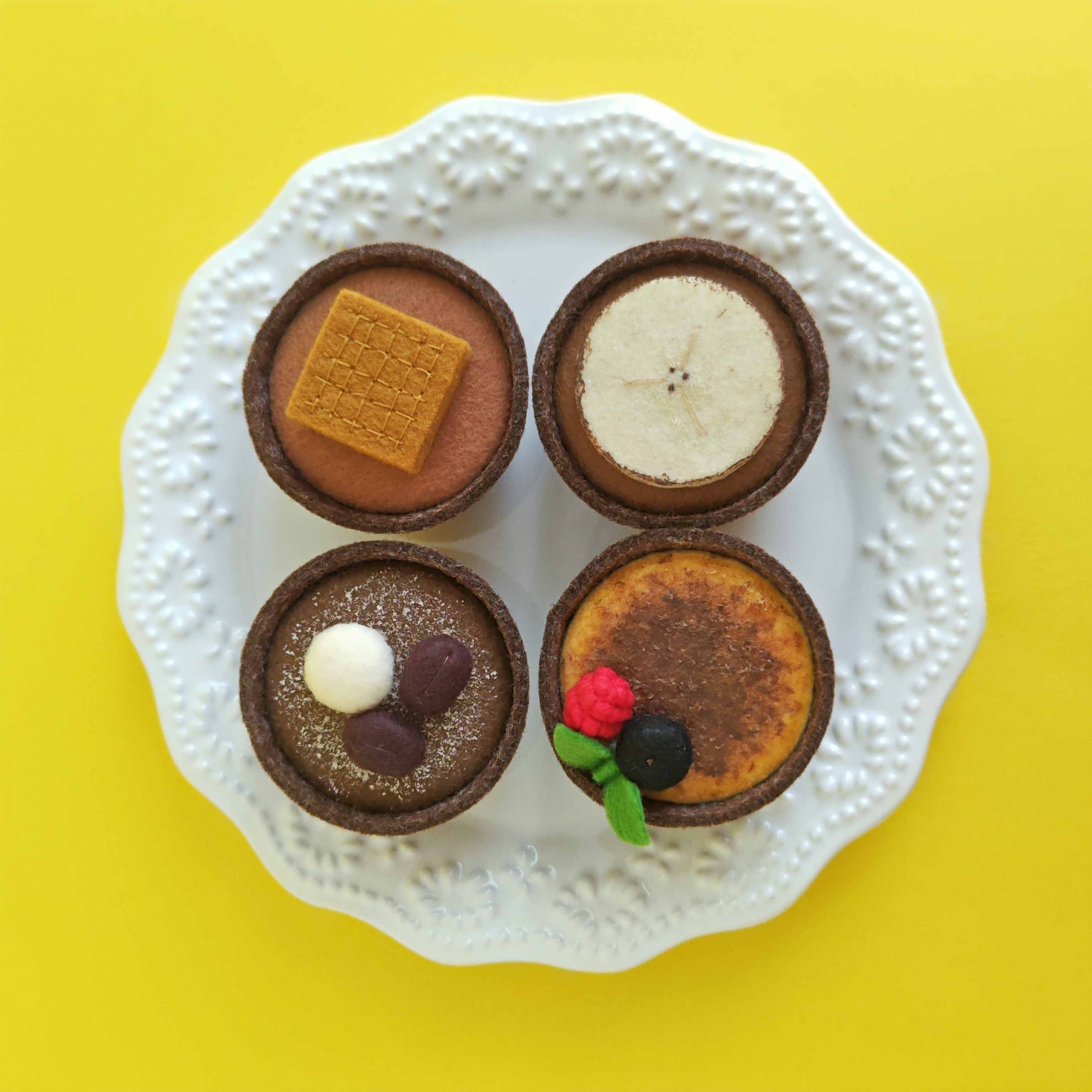 前回のフルーツ・はちみつに続き、ショコラも作りました。コーヒーショコラ、キャラメルショコラ、チョコバナナ、クレームブリュレ初めて作ったクレームブリュレ。キャラメリゼの炙って焦げ目をつけた感じを表現してみました。クレームブリュレ、最初はカスタードプリンにする予定でした。カラメルソースをどうするか、いろいろ試してみたけれどイマイチ納得いくものができず。それならクレームブリュレは?難しいかな?と思いながらもチャレンジしてみました。バナナも軽く焦げ目をつけました。