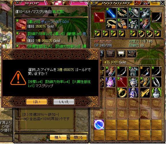どぅもハオです課金きれてたため狩りしてません(*´・ω・)これをいいことに銀行整理していたのでSSが全くございませんあるといったら・・・お○かなビチャさんとの会話くらぃ・・・そぅいや露店でこんなもの見つけました一度でいいからこんなもの拾ってみたぃですねそれではこれにてビューン!!ε≡≡≡≡≡≡c ⌒っ*゜д゜)っにげろ~ありがたいお言葉