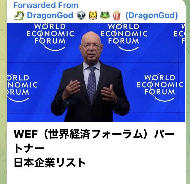 毎年スイスのダボスで開催されていたWorld Economic Forum(世界経済フォーラム)は、世界の政界、ビジネス界の主要なリーダーたちを集めて世界情勢に取り組む国際機関だとされています。創設者はKlaus Schwab(クラウス シュワブ)で、世界の各産業界の一流企業1000社(日本企業は100社ほど)が毎年出席しているようです。もちろん、日本の歴代首相たちや安倍元首相も岸田首相も出席しています。参加者の中に日本銀行黒田総裁やノーベル賞受賞者の山中伸弥さんもいます。昨日お伝えしたコロナ詐欺とジェノサイドを演出した悪人たちの画像の中に菅元総理、岸田総理、山中教授、たちの顔がありました。WEFに出席した彼らとWEFが計画実行させたアジェンダ21(アジェンダ30)と関係がないとは言えません。つまり、コロナプランデミック、人口削減、地球温暖化、食糧不足、果ては、医療、GMO食品、食品添加物、ケムトレールなど、全て彼らが仕組んだ計画犯罪なのです。こちらはWEFのパートナー企業リストです。こちらは、ウクライナ、CIA、FBI、クローンについての暴露こちらはアラベラ ケネディーさんから、ウクライナがディープステートの資金源だと暴露!ディープステートがどのように人々から集めた税金を搾り取っているのか:ウクライナ騒動は、金持ちをもっと金持ちにするコロナパンデミックと同じで、もう一つの詐欺です。ウルトラスーパー金持ちに支配された私たちの政府は、”国家の利益" と言う名の元に意図的に危機を作りました。彼らは毎日あなた方に嘘をつき、ウクライナをサポートするよう洗脳しているのです。そうすれば、彼らはあなた方の税金を軍産複合体に注ぎ込み続けることができるからです。私が最近情報を暴露したように、アメリカの殆どの大企業は二つの(ブラックロック、バンガード)グループに秘密裏に属しています。これらの企業には、レイセオンやロッキード マーティンがあり、この戦争の最も大きい武器の提供者でもあるのです。そして、あなた方が支払った税金が彼らの資金になっています。ウクライナが戦争に勝とうが負けようが、毎日一生懸命働くアメリカ人たちにとって何も変わりません。ブラックロックとバンガードがこの危機を利用して毎日より裕福になっているだけなのです。これからもっと暴露するつもりです。この投稿をシェアして皆に知ってもらってください。こちらはドナルド トランプ ライブ チャンネルからトランプさんのことアメリカはトランプ大統領の声を必要としている。彼こそが歴史上最も攻撃され、いじめられた大統領だ。メディアと民主党が6年間も彼に与えたことは、大統領の人格を破壊することだった。大統領はそのようなことにもめげずにアメリカの人々に奉仕している、アメリカファーストにするために。ドナルド J. トランプ:” これから何かが起きるからそれまで待って、素晴らしいことが起きるまで "私は今まで誰もそうしたことがないほどあなた方のために戦おう - DJT忘れないで、全ては子供たちを救うためなんだということ。