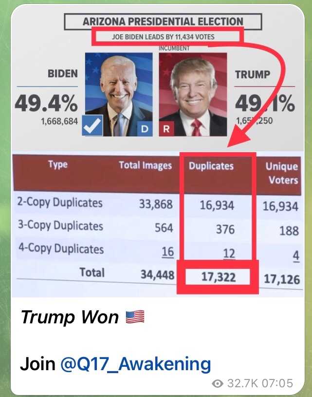 アリゾナ、マリコパ群で、17,322票が重複され集計されたことがわかった。