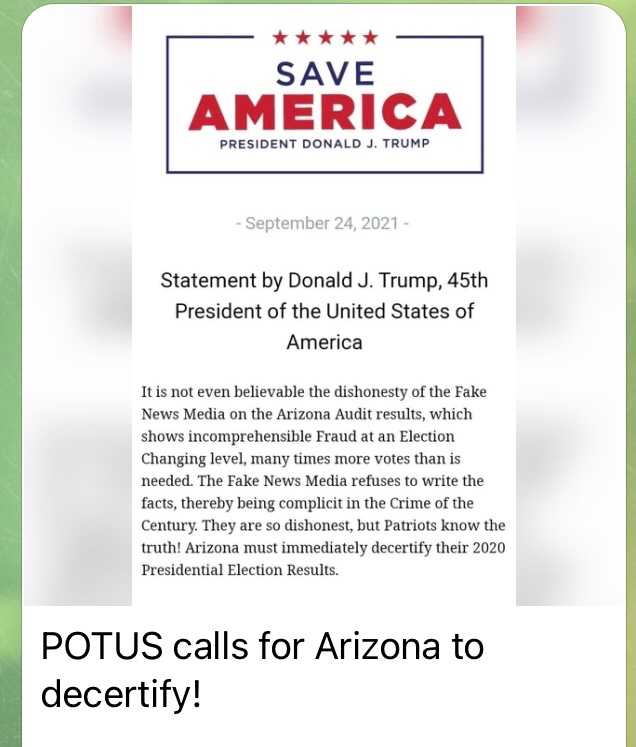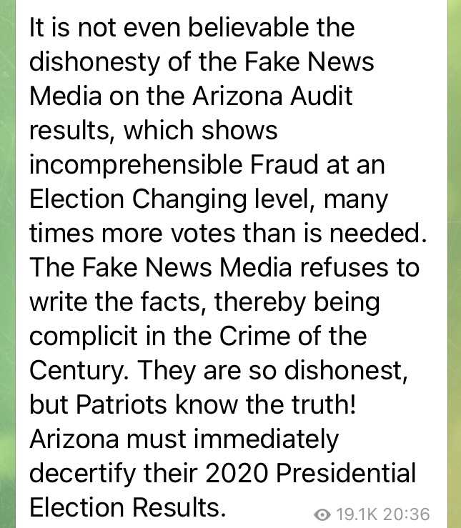 アリゾナ票監査結果についてフェイクニュースメディアの不正行為は信じられないほど酷いが、そのことは必要以上の何倍もの投票数で選挙結果を変えるレベルの不可解な不正を我々に見せた。フェイクニュースメディアは事実の報道を拒否している、だから世紀の犯罪の共犯者だ。彼らは非常に不誠実だ、愛国者達はそれを知っている!