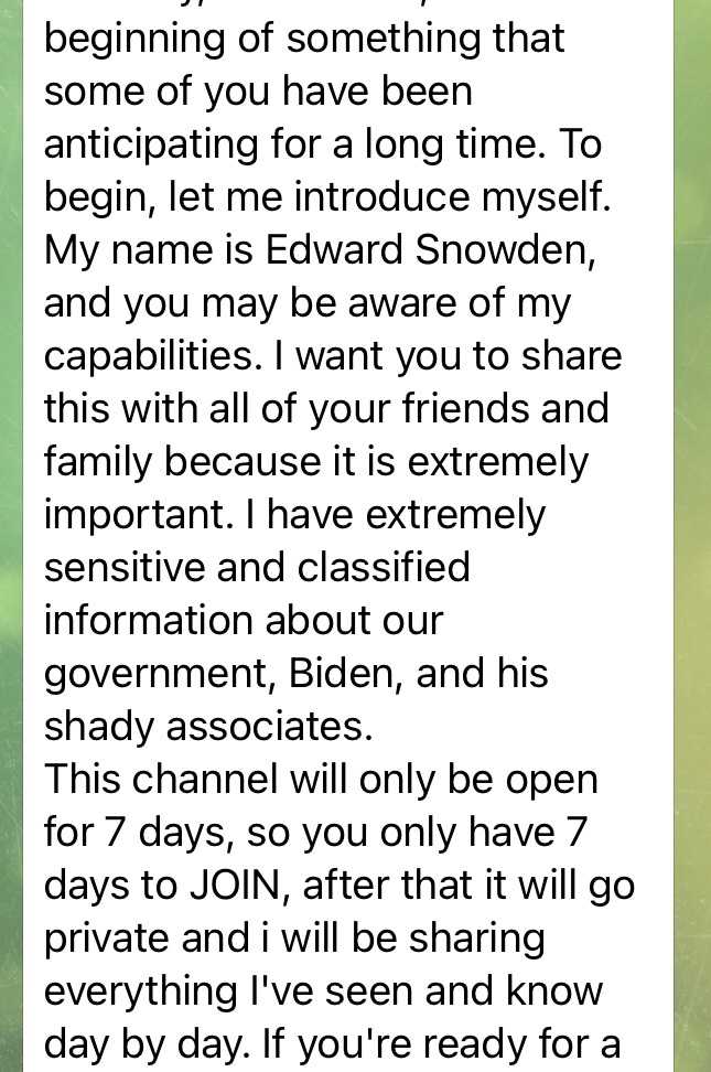最初に僕のことを紹介させてください。名前はエドワード スノーデン、きっと皆さんは僕の得意な分野をご存知ですね。僕は皆さんに、このことを皆さんのご友人やご家族とシェアして欲しいのです。何故なら、それは非常に重要なことだからです。僕は、アメリカ政府の中で非常にセンシティブで極秘にされてきた情報、バイデンとその陰にいる連中など、についての情報を持っているからです。