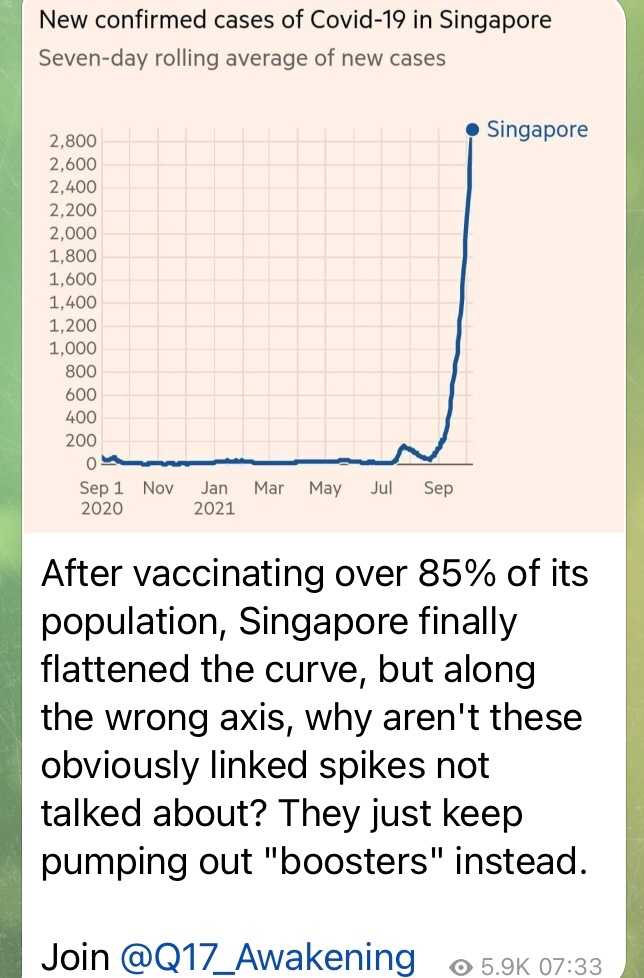 人口の85%がワクチン接種をした後、シンガポールはついにカーブがフラットになりましたが、それは軸が間違っていたのです。このように明らかに関係あるスパイクが話されないことが疑問です。彼らはその代わり、ブースターショットを持ち出しているのです。