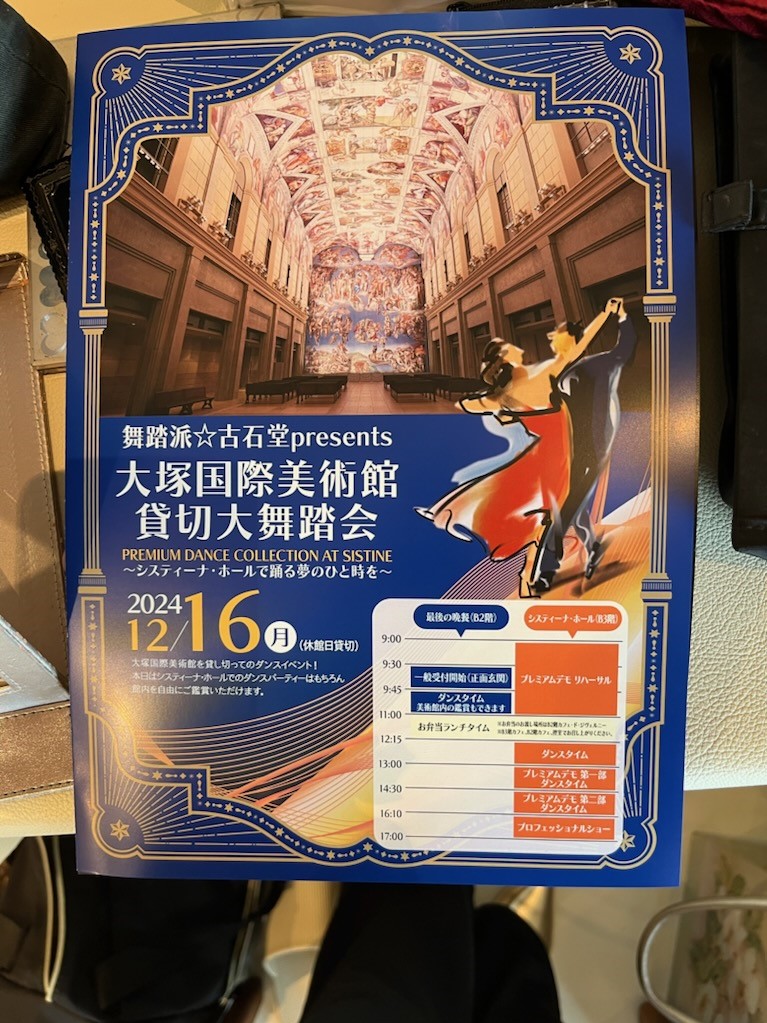 徳島県鳴門市には地元の大塚製薬が、自社の窯業の技術の粋を尽くして、世界中の美術館の誇る作品を陶板に写した「大塚国際美術館」というユニークな美術館があります ここへ行くと世界的名画の数々の実寸がわかると好評で、何年か前に紅白歌合戦でここのシスティーナ礼拝堂から米津玄師さんが、歌ったのでファンの聖地になり、歌舞伎も毎年上演され、重要な観光地になりましたこの秋の初め、四国の若手ダンサーの間でここで、ここを1日借り切って、ここのシスティーナで舞踏会を開こう、という計画が発案されました・・・吉祥天の先生も発案者のひとりです これがそのパンフレット、招待状は四国、関西一円のダンス教室に送られ、「えっ、美術館でダンスパーティ?」「システーナ礼拝場で踊れるの?」「ここの歌舞伎、見に行ってる」「きれいだよ~」「もし、本当のシステーナで踊ったらどうなる?」「即座に警察が来て捕まるよ」「踊る前にいつも大混雑だから踊る余地なんかないでしょ」と話題沸騰 ダンス仲間のマサヨさんが「吉祥天さんがデモンストレーションに出るんだったら、見に行くわ」と言うので「出る予定ないけど、一緒に見に行きましょう、こんな企画はこの後ないと思うから」と言っていたら マサヨさんのお嬢さんが「お母さん、こんな催しはこの後無いと思うから、一生の思い出にぜひ出演しなさいよ」と勧め、 マサヨさんがその気になったので吉祥天もつられて「じゃ、私も出るわ」「先生、私と**教室のマサヨさん、出演します」「ありがとうございます」・・・ということになりましたそして当日同じ教室のやはり出演するニシ夫妻が迎えに来てくれて朝9時過ぎに鳴門大橋のたもとの大塚美術館に到着 大きな崖をくり抜いて造られた地下4階、地上2階の大建造物 こんなの…美術館のフォームページから拝借ここの地下3階の玄関を入って、チケット渡してプログラムやスイーツ券もらって見上げると首痛くなるほど長いエスカレーターに乗ると ここがシステーナ入り口、照明スタッフ準備中 出演者は2階の楽屋・・・ここは会議などに使う部屋で、絵の展示はしていませんので普段は入れないところ・・・記念に一枚向こうの橋は大鳴門橋・・・車両が行き交っています これだけのもの、どうやってコピーしたんだろう・・・ そして開演・・・企画された先生方のご挨拶初めてのことばかり・・・大変だったでしょうね デモストレーションの始まり・・・42組ありました 合間には自由に踊れるダンスタイム 声楽家や南米音楽の演奏者、サキソフォーン奏者の方達が、生演奏で盛り上げてくれます 入場者は自由の館内を見て回れます・・・広すぎて迷子になる人続出 ここがモネの庭・・・外にあります前方の壁の中はモネの睡蓮・・・フランスのオランジェリー美術館も一部屋をこのように使って展示していましたここでスイーツ券を見せると、ケーキとコーヒー、紅茶のセットがいただけますこうやって、踊って見て、お昼いただいて(これは入場券と交換)休んでお茶飲んで・・・美術館の閉館時刻の午後五時でおひらき夢から覚めた一同、夕暮れの鳴門海峡を眺めながら帰宅おもしろかった、楽しかった・・・また企画してくれないかな?・・・
