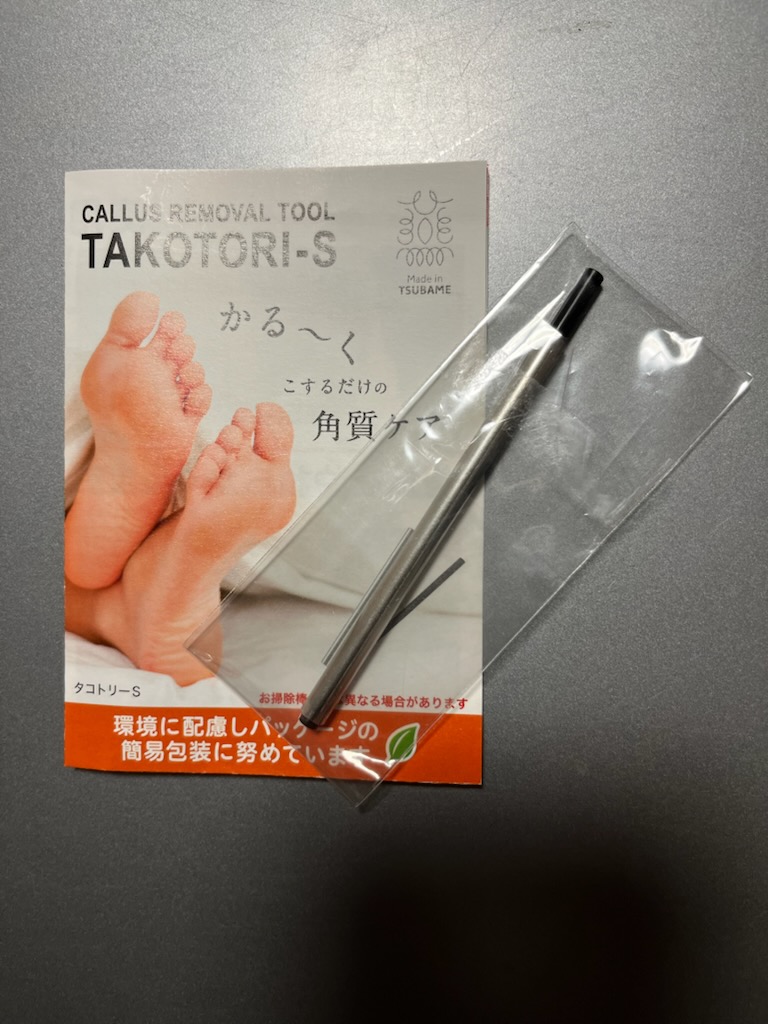 お久しぶりでございますこのところ忙しくて夕食を済ませ、片付けも終わった、ら眠気に襲われ、うつらうつらと半分夢の中、力振り絞って入浴済ませると、枕元に積み上げた、読みたい、読まなくちゃいけない本達ー「枕元図書館」と、呼んでいますがーの表紙も開く余裕なく寝落ち、」の毎日でしたが昼間歩いていて右足の4番目、小指の隣、が痛むのに気が付きましたなにか鋭いものが指の横を歩くたびに突いてくる・・・これは小指の爪が尖って隣の指の側面を突いているのかも・・・と爪切りで小指の爪をぎりぎりまで切ってみたけど、やっぱり痛い、なにかが突いてくる入浴後、よいしょと右足を思いきり引き寄せ、よいしょ、と指をひっくり返して顔を近づけてみると・・・これなかなか無理のある姿勢です・・・4番目の指の側面が固くなって色も変わって足の裏みたいになっている靴で締め付けられた足先・・・小指の爪が4番目の指を突き続けてこんなになったのかもしれないこれはタコというものじゃないかこれは皮膚科か外科か…その前に薬局に行こうか・・・などと考えながら、時々買い物するフェリシモのカタログを繰っていたらありました・・・これ「タコトリ」・・・なんと直接的でわかりやすい名前 早速注文したら来ました この銀色の筒は中空で両端が内側に向かった刃になっていて、これでかる~くタコをこすると、タコがきれいに削られて痛みから解放、というもの、上に飛び出している黒い棒は削りカスを押し出すためのもの、とか 棒で押し出すほど削りカスが出るのか・・・これは面白そうその夜、説明書の通り、入浴後のふやけた皮膚に、このタコキリを90度の角度で当てて同方向に軽くこすってみました なるほど、固くなったタコの上を通ると感触が違う 軽く軽く同方向、と心で唱えながらこすり続ける吉祥天10分後、(どのくらい削れたかな)と期待しながら黒い棒を通してみると・・・あれ、なにもない、でもタコは明らかに削る前より滑らかになっている・・・さらに10分こすっても・・・何もなし、でもタコはさっきより柔らかく滑らかになっている・・・なんだこれは、削りカス見たかったのに・・・ 説明書を読んでみると・・・「削りカスの量は人によって違いがあります」・・・同じことして「削りカスが少ない、写真と違う」って苦情言った人があったのかな・・・同好の友よともあれ、ここしばらく、入浴後に無理な姿勢を我慢しながらタコキリでタコをこすっている吉祥天です・・・大分痛みはなくなりました・・・カスは相変わらずはっきり見えるほどに出ませんがタコタコと騒いでいて思い出したこと先月アリアンスの神戸ツアーに行った帰り道、淡路島のSAに立ち寄った時、セツコさんが「ここは明石タコが有名だから」とタコ焼きを買ってきて、皆に一個づつ振舞ってくれました食べた後「タコ、入ってた?」「そういえば・・・すごく小さかった」「うん、あるかないかのような・・・」「いつもと違う」「何も入ってないのかと思ったら最後に喉のところで小さい感触が」「そういえばタコが不足で外国から輸入してるって、聞いた」「外国の観光客の人たちにタコ焼きが人気で、大阪では大行列のニュース見たけど」「そのくらいで日本中で不足する?」「いやほんとよ、ウチ酢だこが好きなんだけど、タコの値段ずいぶん高くなってる」「ここは産地なのに・・・」・・・タコの不足を実感した一同でした・・・