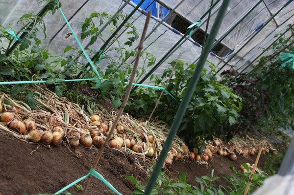 玉ねぎはハウスの中で乾燥中。