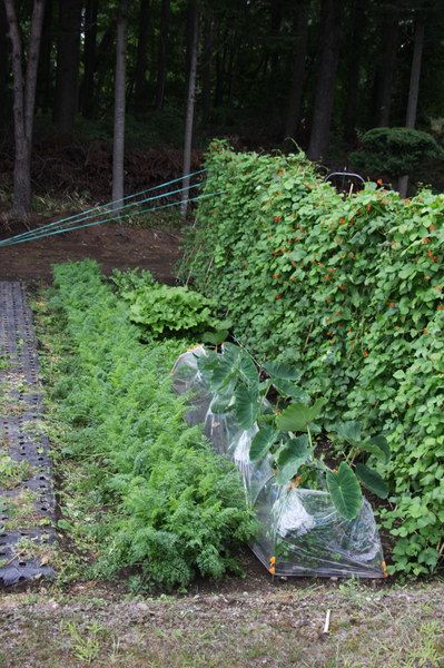 花豆は実が沢山付いて、人参も大きく伸びてます