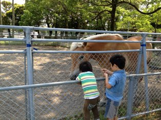 宮崎育成牧場は今日も家族連れでいっぱいでした。久しぶりの育成牧場で馬に草をあげて喜んでます。愛息弟の暴れっぷりは見事なものです。馬も引き気味です。妻が帰って来るまで沢山遊びました。( ´ ▽ ` )ノ - 育成牧場には公園には相応しくないおじちゃんや若者が沢山いました。じつは日本ダービーが開催されてて、ウィンズに馬券を買いに来てる人達でした。馬は勝ちましたかね?
