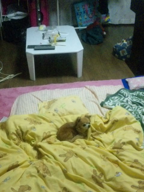 カミさんお泊り用の上にいるのは、内緒で持ち込んでいるワンコです(;^_^A